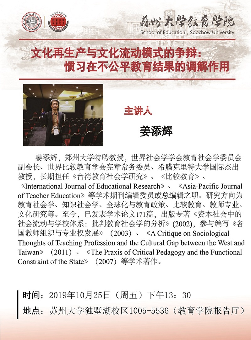 学术报告:文化再生产与文化流动模式的争辩:惯习在不公平教育结果的调解作用[10.25]