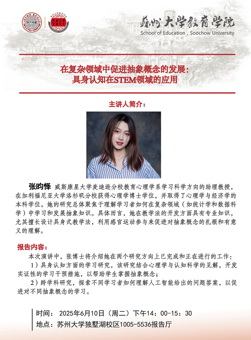 学术报告:在复杂领域中促进抽象概念的发展:具身认知在STEM领域的应用[6.10]