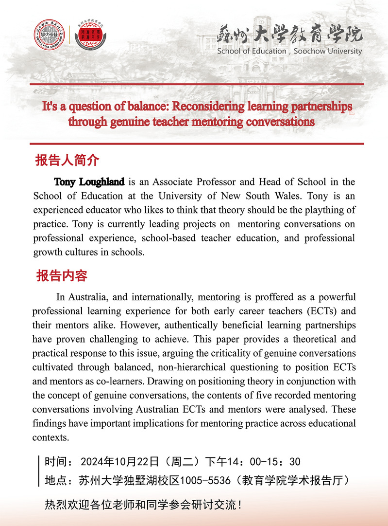 学术报告:It's a question of balance: Reconsidering learning partnerships through genuine teacher mentoring conversations[10.22]