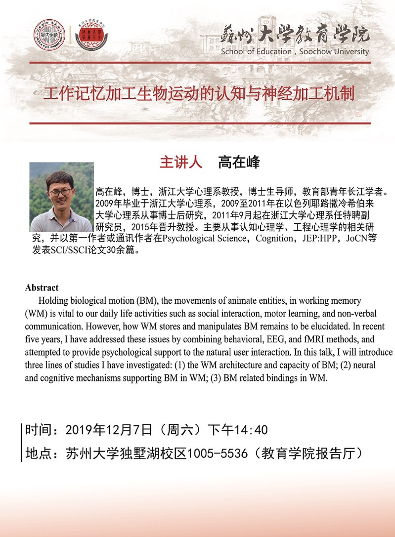 学术报告:工作记忆加工生物运动的认知与神经加工机制[12.7]